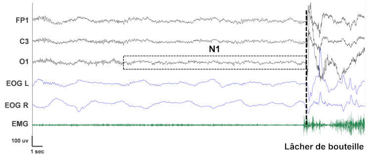 Throughout the experiment, participants wore sensors, placed on their head, chin and around their eyes to monitor their cerebral, ocular and muscular activity. From these signals, we could monitor the sleep state of participants in real time and divide the sample into three groups: those who stayed awake during the whole break, those who dozed off (and entered only the first stage of sleep called N1), and those reached the second stage, N2.